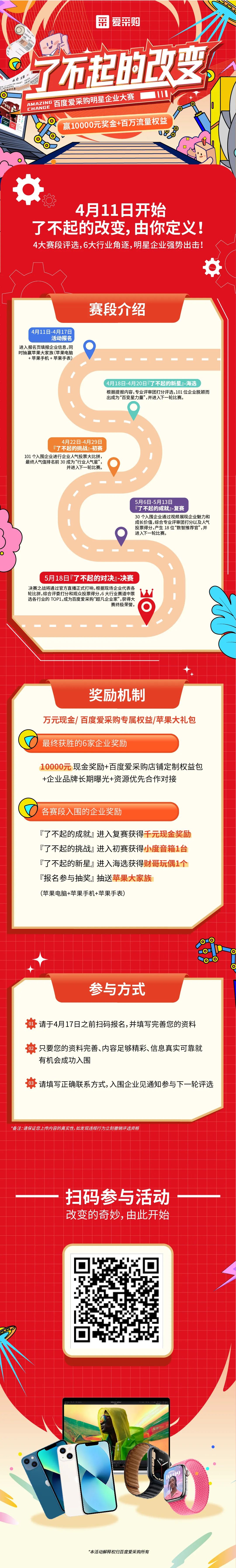 這個春天百度愛采購明星企業(yè)大賽熱血來襲,我們將面向平臺內所有店鋪商家開展一場超級評選活動,尋找屬于百度愛采購的明星企業(yè)改變故事,報名參與有機會贏10000元現(xiàn)金、百萬愛采購流量權益,只要報名填信息就能參與領iPhone大家族!