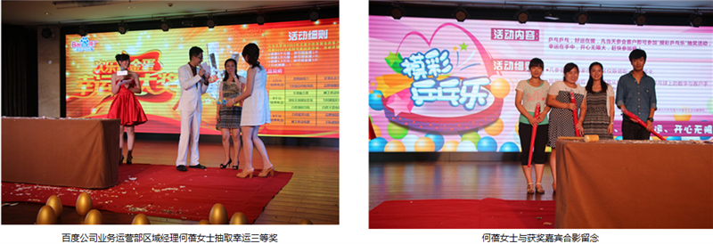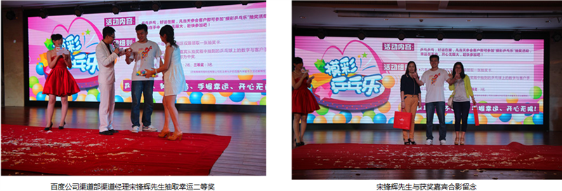 由于市場(chǎng)部和百度客服部的精心策劃和認(rèn)真籌備,本次答謝會(huì)在各環(huán)節(jié)上相比以往都做了創(chuàng)新和改進(jìn),“摸彩乒乓樂”活動(dòng)環(huán)節(jié)抓住了客戶心理,解決了客戶中途離場(chǎng)的難題,客戶中途離場(chǎng)率創(chuàng)造歷史新低。續(xù)費(fèi)砸金蛋送禮品環(huán)節(jié),更是把本次會(huì)議從一個(gè)高潮推向另一個(gè)高潮??头康耐聜儯脱鐣?huì)環(huán)節(jié)的節(jié)目也做了精心的準(zhǔn)備,使客戶在晚宴時(shí),既嘗到了菜肴的美味,又對(duì)精彩的節(jié)目表演贊嘆不已。