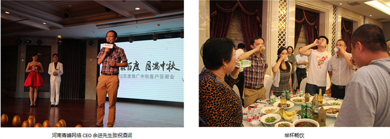 一杯杯酒,一首首歌,道不盡的問候,送不完的祝福,在這收獲的季節(jié),讓我們共同舉杯,祝福彼此。通過本次答謝會(huì),進(jìn)一步溝通了客服人員與客戶的感情,也更加鞏固了百度推廣在客戶心中的品牌形象,堅(jiān)定了他們與百度攜手,從一個(gè)成功走向另一個(gè)成功的信心!