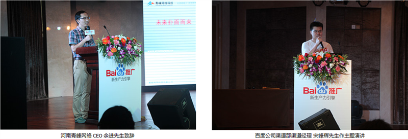 蒞臨本次答謝會(huì)現(xiàn)場(chǎng)的領(lǐng)導(dǎo)有:百度公司渠道部渠道經(jīng)理宋鋒輝先生,百度公司業(yè)務(wù)運(yùn)營(yíng)部區(qū)域經(jīng)理何蓓女士,河南青峰網(wǎng)絡(luò)科技有限公司CEO 余進(jìn)先生。會(huì)議前半場(chǎng),青峰網(wǎng)絡(luò)CEO余進(jìn)先生致開場(chǎng)詞,并帶來了《未來?yè)涿娑鴣怼返木恃葜v,帶領(lǐng)與會(huì)嘉賓一起回顧了互聯(lián)網(wǎng)發(fā)展的潮流,并以自己多年互聯(lián)網(wǎng)從業(yè)經(jīng)驗(yàn),預(yù)測(cè)未來互聯(lián)網(wǎng)發(fā)展的趨勢(shì),引得臺(tái)下陣陣掌聲。接下來,由百度公司渠道部渠道經(jīng)理宋鋒輝先生帶來主題演講,宋經(jīng)理向到場(chǎng)的嘉賓介紹了百度2013年在各領(lǐng)域取得的巨大成就,并著重介紹了百度推廣新推出的品牌起跑線、問答營(yíng)銷、企業(yè)之窗等新產(chǎn)品,擴(kuò)大了客戶網(wǎng)絡(luò)營(yíng)銷的視野,堅(jiān)定了與會(huì)嘉賓與百度推廣一起成長(zhǎng)的信心。