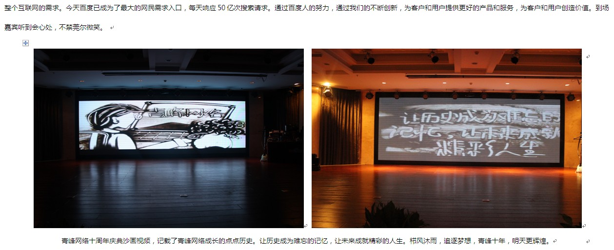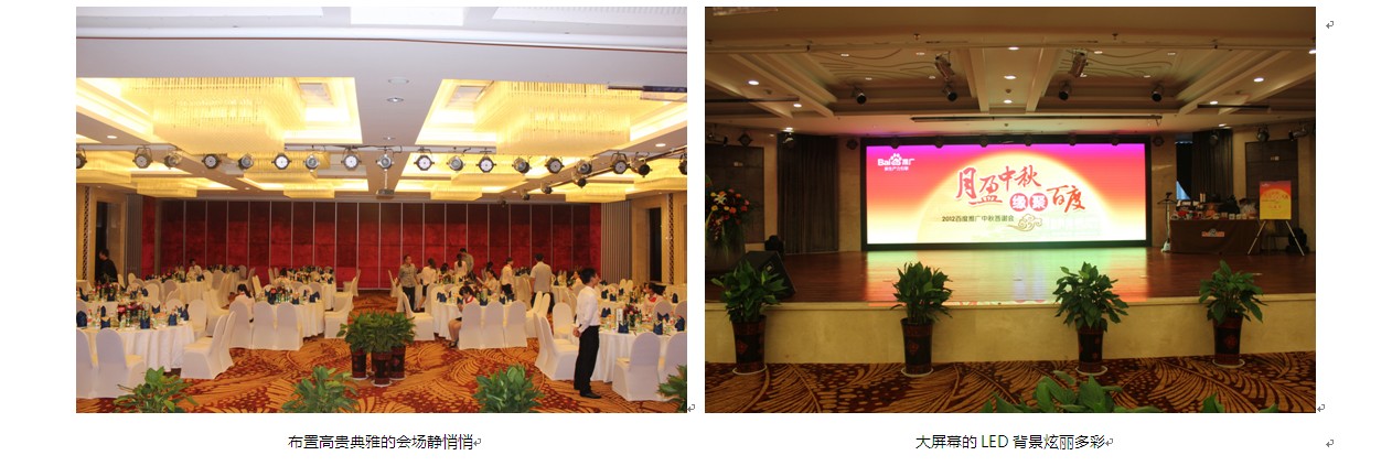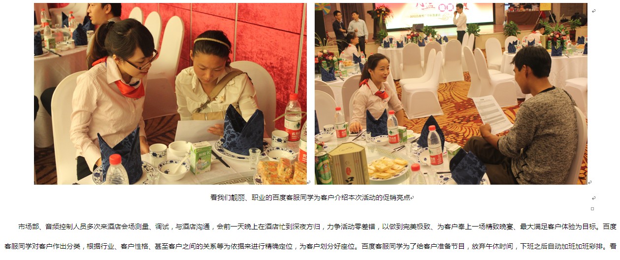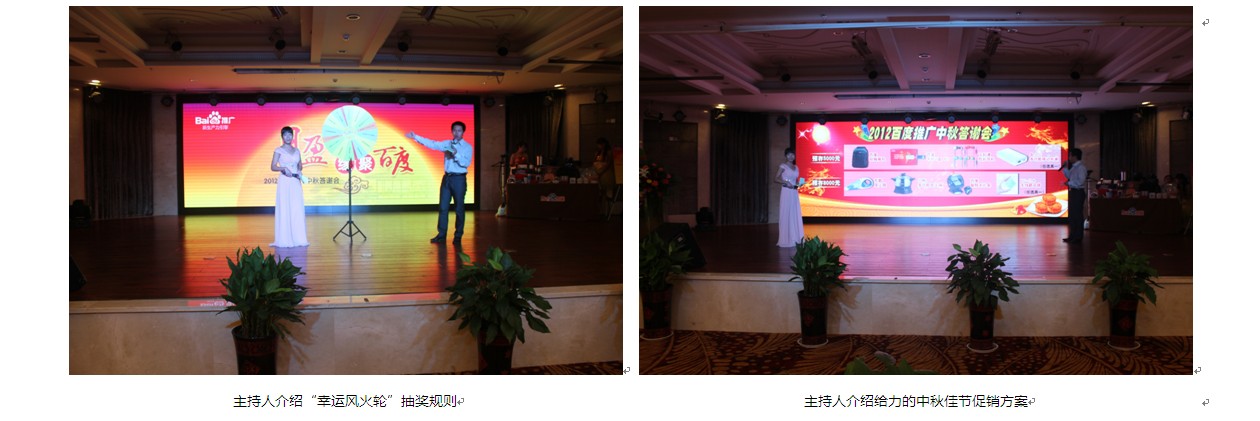 本次活動,舞臺背景使用大屏幕LED,效果絢麗多彩??蛻糇郎暇臄[放了啤酒、飲料、礦泉水、月餅、小點心、酸奶等飲食,還用心準(zhǔn)備了餐巾紙。會務(wù)人員安排井然有序,游戲環(huán)節(jié)新穎勁爆,促銷政策激動人心,續(xù)費抽獎火熱爆棚、熱烈的客戶互動、真誠的客戶感言。無論是酒店檔次,舞臺效果還是節(jié)目的精彩程度都讓在場的客戶朋友們充分感受到了新鄉(xiāng)百度人的熱情和真誠。