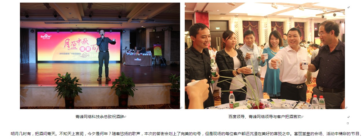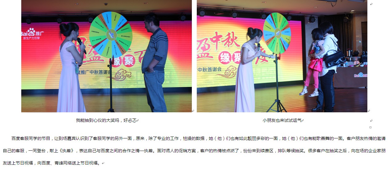 在這個秋月朗照,丹桂飄香的夜晚,我們匯聚四面八方的歡歌笑語,舉辦了一場完美的感恩盛宴?;顒蝇F(xiàn)場,新鄉(xiāng)企業(yè)家朋友按捺不住他們與百度合作的熱情,紛紛與自己的百度客服人員分享百度推廣的心得體會,甚至與我們的百度客服同事聯(lián)袂登臺獻歌,表達(dá)自己的感激之情。一曲《執(zhí)著》,一曲《兄弟》,表達(dá)了對百度推廣的“執(zhí)著之心”,與百度推廣的“兄弟之情”。