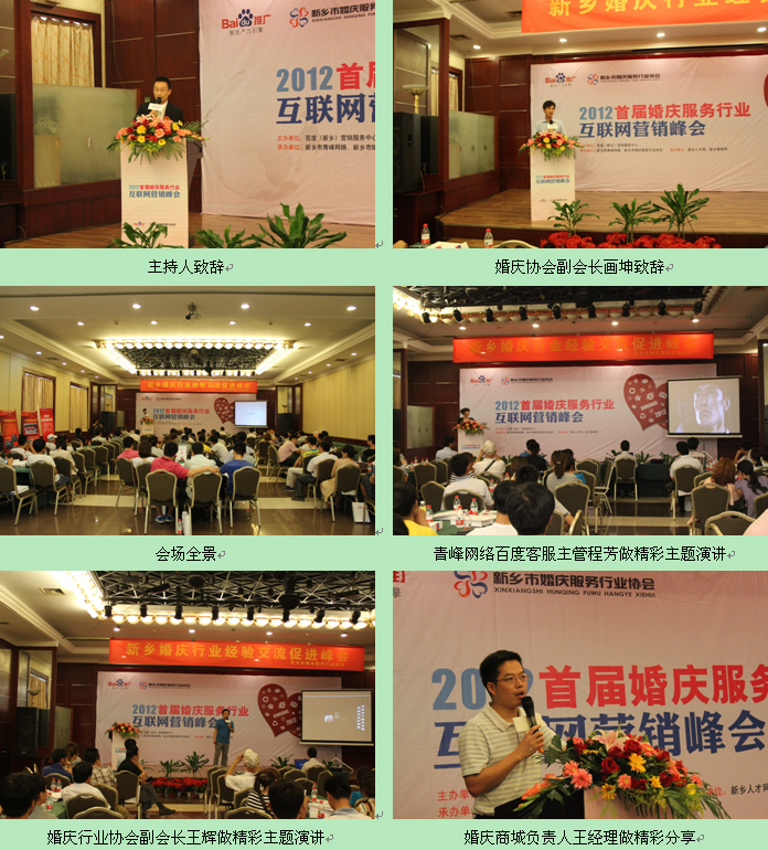 6月26日,2012首屆婚慶服務(wù)行業(yè)互聯(lián)網(wǎng)營(yíng)銷(xiāo)峰會(huì)在新鄉(xiāng)賓館三樓召開(kāi),本次峰會(huì)由百度新鄉(xiāng)地區(qū)營(yíng)銷(xiāo)服務(wù)中心主辦,由新鄉(xiāng)市青峰網(wǎng)絡(luò)科技有限公司、新鄉(xiāng)市婚慶服務(wù)行業(yè)協(xié)會(huì)承辦,由新鄉(xiāng)人才網(wǎng)、新鄉(xiāng)婚嫁網(wǎng)協(xié)辦。