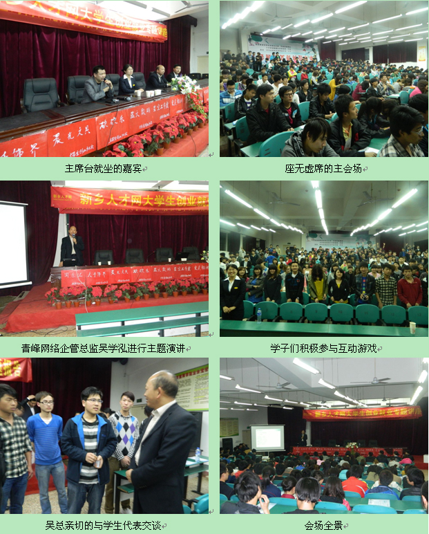 2012年4月19日,由新鄉(xiāng)人才網(wǎng)與新鄉(xiāng)青峰網(wǎng)絡(luò)聯(lián)合舉辦的校園巡講在新鄉(xiāng)技師學(xué)院拉開帷幕,本次巡講由新鄉(xiāng)青峰網(wǎng)絡(luò)企管總監(jiān)吳學(xué)泓先生、新鄉(xiāng)人才網(wǎng)市場部經(jīng)理陳永先生、開元明都大酒店人力資源部總監(jiān)王彩賢女士擔(dān)任主講,新鄉(xiāng)青峰網(wǎng)絡(luò)企管總監(jiān)吳學(xué)泓為這些莘莘學(xué)子講解了如何從校園到職場的華麗轉(zhuǎn)身,從九個方面闡述了擇業(yè)、就業(yè)、發(fā)展對人生的意義,它們分別是:一、認(rèn)識形勢與認(rèn)識自己 二、遠(yuǎn)大理想與腳踏實地 三、找工作與找對象 四、價值與使用價值 五、就業(yè)與擇業(yè) 六、博學(xué)與專業(yè) 七、知識與經(jīng)驗 八、付出與回報 九、堅持與轉(zhuǎn)變。