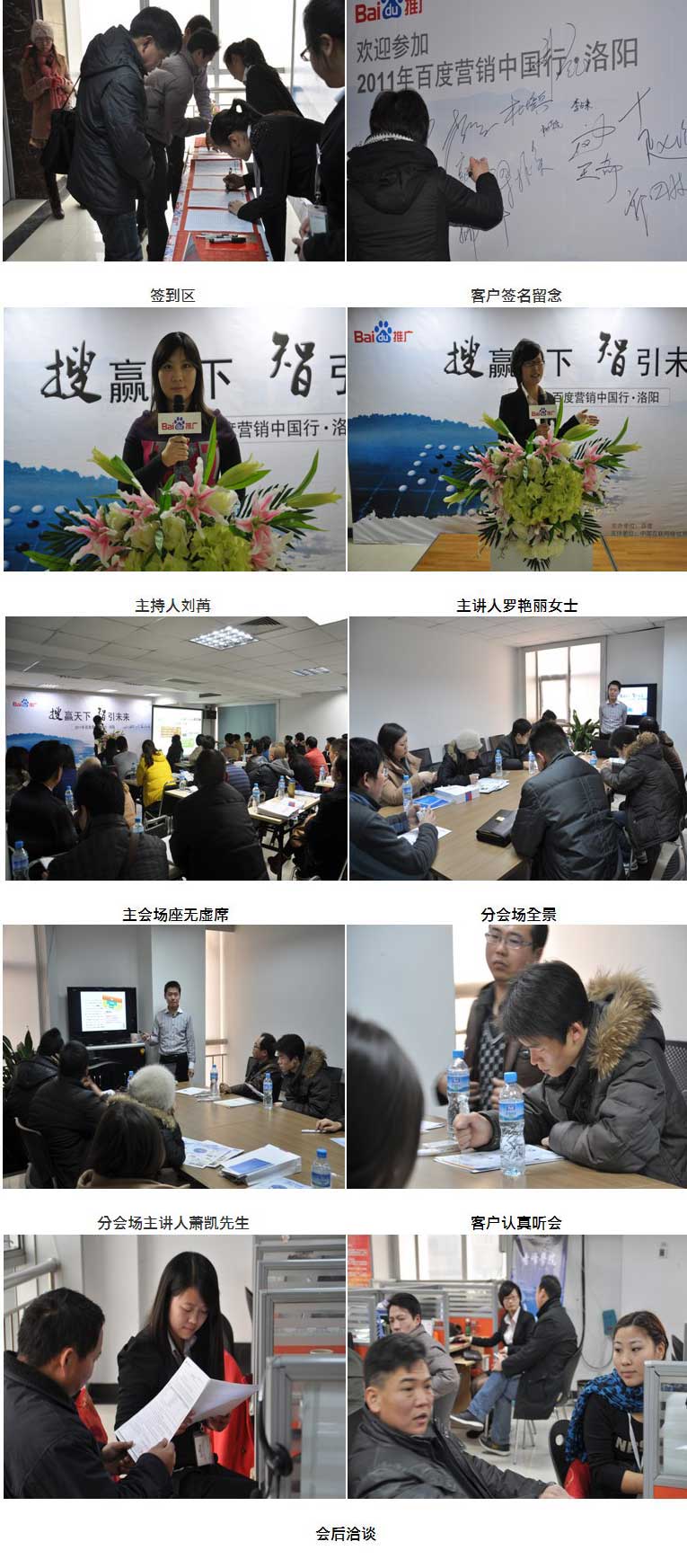 2011年12月21日“搜贏天下 智引未來(lái)百度營(yíng)銷中國(guó)行”洛陽(yáng)站在洛陽(yáng)市青峰網(wǎng)絡(luò)科技有限公司會(huì)議室“青玉案”隆重舉行。通過(guò)會(huì)議講解使客戶清晰了解百度搜索推廣產(chǎn)品是如何獲取大量精準(zhǔn)商機(jī)的,從而促使客戶消除疑慮,加大搜索引擎營(yíng)銷推廣力度,正視網(wǎng)絡(luò)營(yíng)銷投放效果產(chǎn)出,推動(dòng)客戶使用搜索引擎營(yíng)銷方式進(jìn)一步成熟。用實(shí)際案例突顯搜索推廣營(yíng)銷為企業(yè)客戶帶來(lái)的實(shí)際效果,影響潛在客戶的市場(chǎng)營(yíng)銷方式。