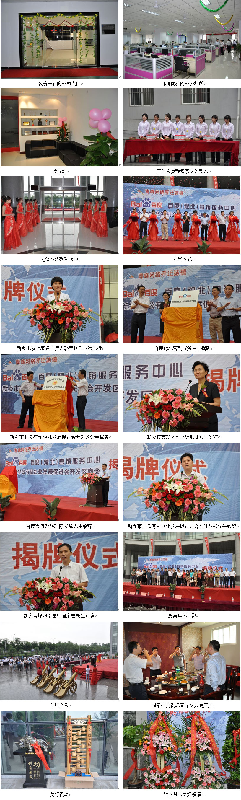 6月25日上午11時(shí),百度(豫北)營銷服務(wù)中心、新鄉(xiāng)市非公有制企業(yè)發(fā)展促進(jìn)會開發(fā)區(qū)商會揭牌儀式暨青峰網(wǎng)絡(luò)科技有限公司喬遷儀式在新鄉(xiāng)市開發(fā)區(qū)火炬園隆重舉行。新鄉(xiāng)市高新區(qū)副書記郝莉女士、百度渠道部經(jīng)理陳禎鋒先生、百度高級渠道經(jīng)理蘇實(shí)先生、新鄉(xiāng)市非公有制促進(jìn)會會長姚叢彬先生、青峰網(wǎng)絡(luò)合作伙伴和全體員工共二百多人參加大會。