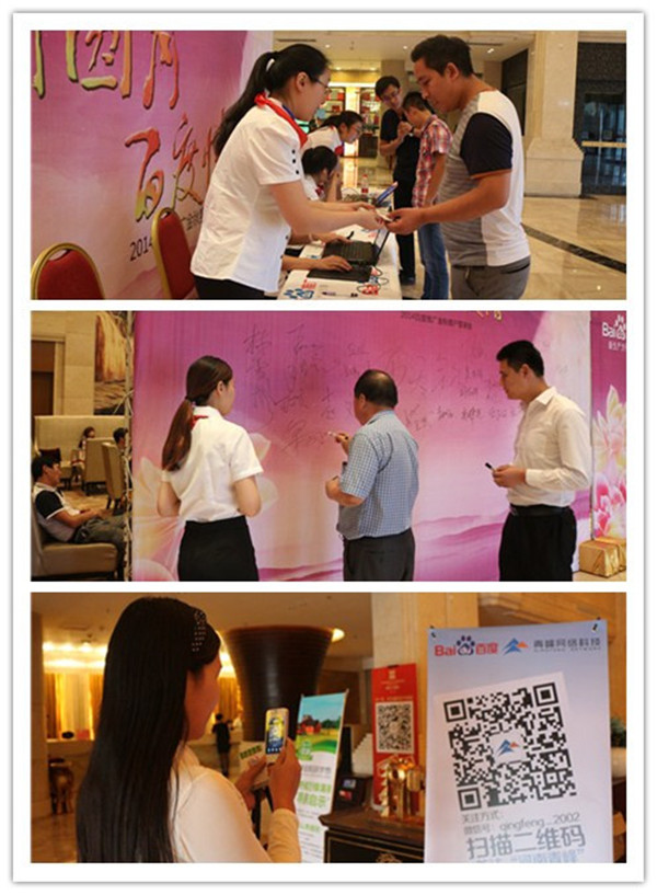 酒店大廳中央,四位美麗的百度推廣顧問(wèn)面帶微笑,迎接客戶的到來(lái),在“團(tuán)圓月,百度情”背景墻的映襯下,她們顯得更加光彩照人。每當(dāng)有客戶到來(lái),她們都細(xì)心地上前接待,指引客戶簽到,在背景墻簽字,掃官方微信二維碼關(guān)注公司微信公眾平臺(tái),送出貼心的小禮品,很多客戶的簽名如行云流水,頗有大家風(fēng)范,看的小編也是羨慕不已,各式各樣特色的簽名讓背景墻增色不少。